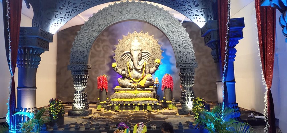 बचेली। बचेली नगर के एनएमडीसी हाईटेक काॅलोनी में हर वर्ष की तरह इस वर्ष गणेश चतुर्थी पर दुर्गा मंडप में भगवान श्री गणेश की भव्य और अद्भुत प्रतिमा स्थापित की गई है। पत्थर जैसी गहरी कारिगरी, शिल्पकारी से सजे और विशाल आभामंडल के बीच विराजमान गणेश जी की स्वरूप श्रद्वालुओ के लिए अद्वितीय आकर्षण का केन्द्र बना हुआ है। प्रतिमा को देखते ही भक्ति और शांति का अद्भुत अनुभव होता है। गणपति जी को ध्यान मुद्रा में दिखाया गया है। स्टोन लाईक लूक में प्रतिमा बनाई गई है और इसके पीछे सूर्य जैसा विशाल आभामंडल दिख रहा है। प्रतिमा को स्थापत्य शैली के मेहराबो और स्तंभो से घेरकर सजाया गया है, जिससे यह मंदिरनुमा प्रभाव देता है। चारो ओर फूल की सजावट, दीप से सजावट की गई है।