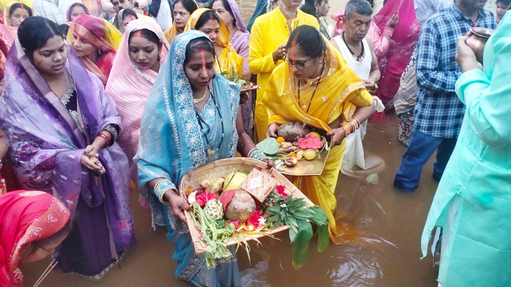 सुबह-सुबह साम्प्लेक्स नाला घाट पर श्रद्धालुओं की अपार भीड़ उमड़ी। घाट पर व्रतधारियों ने विधि-विधान के साथ पूजा-अर्चना की और भगवान भास्कर को अर्घ्य अर्पित कर 36 घंटे के निर्जला व्रत का समापन किया।