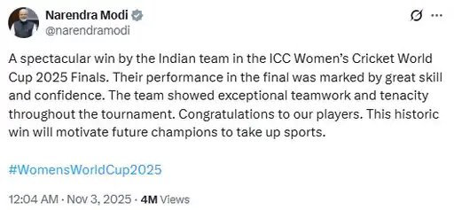 प्रधानमंत्री नरेंद्र मोदी ने सोशल मीडिया पर लिखा, ICC विमेंस क्रिकेट वर्ल्ड कप 2025 के फाइनल में भारतीय टीम की शानदार जीत। फाइनल में उनका प्रदर्शन अद्भुत कौशल और आत्मविश्वास से भरा था। टीम ने पूरे टूर्नामेंट में असाधारण टीम वर्क और दृढ़ता दिखाई। हमारी खिलाड़ियों को बधाई। यह ऐतिहासिक जीत भविष्य के चैंपियन खिलाड़ियों को खेलों में शामिल होने के लिए प्रेरित करेगी।