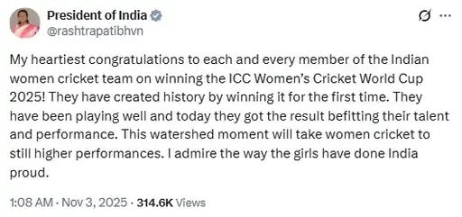 राष्ट्रपति द्रौपदी मुर्मू ने लिखा, भारतीय विमेंस क्रिकेट टीम की सभी मेंबर्स को ICC विमेंस क्रिकेट वर्ल्ड कप 2025 जीतने पर मेरी हार्दिक बधाई। उन्होंने पहली बार जीत हासिल करके इतिहास रच दिया है। वे अच्छा खेल रही हैं और आज उन्हें अपनी प्रतिभा और प्रदर्शन के अनुरूप परिणाम मिला है। यह निर्णायक क्षण महिला क्रिकेट को और भी ऊंचाइयों पर ले जाएगा। जिस तरह से लड़कियों ने भारत को गौरवान्वित किया है, मैं उनकी प्रशंसा करती हूं।