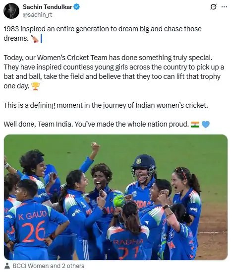 सचिन तेंदुलकर ने एक्स पर लिखा, 1983 ने एक पूरी पीढ़ी को बड़े सपने देखने और उन सपनों को पूरा करने के लिए प्रेरित किया। आज, हमारी महिला क्रिकेट टीम ने कुछ सचमुच खास किया है। उन्होंने देश भर की अनगिनत युवा लड़कियों को बल्ला और गेंद उठाने, मैदान में उतरने और यह विश्वास करने के लिए प्रेरित किया है कि वे भी एक दिन यह ट्रॉफी उठा सकती हैं। यह भारतीय महिला क्रिकेट की यात्रा में एक निर्णायक क्षण है। शाबाश, टीम इंडिया। आपने पूरे देश को गौरवान्वित किया है।
