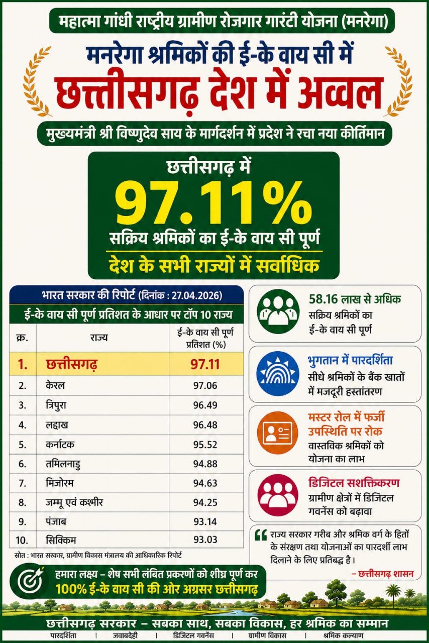 महात्मा गांधी राष्ट्रीय ग्रामीण रोजगार गारंटी योजना मनरेगा के तहत श्रमिकों की ई-केवाईसी (e-KYC) प्रक्रिया को पूरा करने में छत्तीसगढ़ ने देश भर में अग्रणी स्थान हासिल किया है। प्रदेश में लगभग 58.16 लाख से ज्यादा मजदूरों की डिजिटल वेरिफिकेशन (e-KYC) पूरी की गई हैए जो भुगतान में पारदर्शिता सुनिश्चित करती है। यह डिजिटल प्रक्रिया फर्जी जॉब कार्डों को हटाने और सीधे वास्तविक लाभार्थियों के बैंक खातों में मजदूरी पहुंचाने में मदद कर रही है।