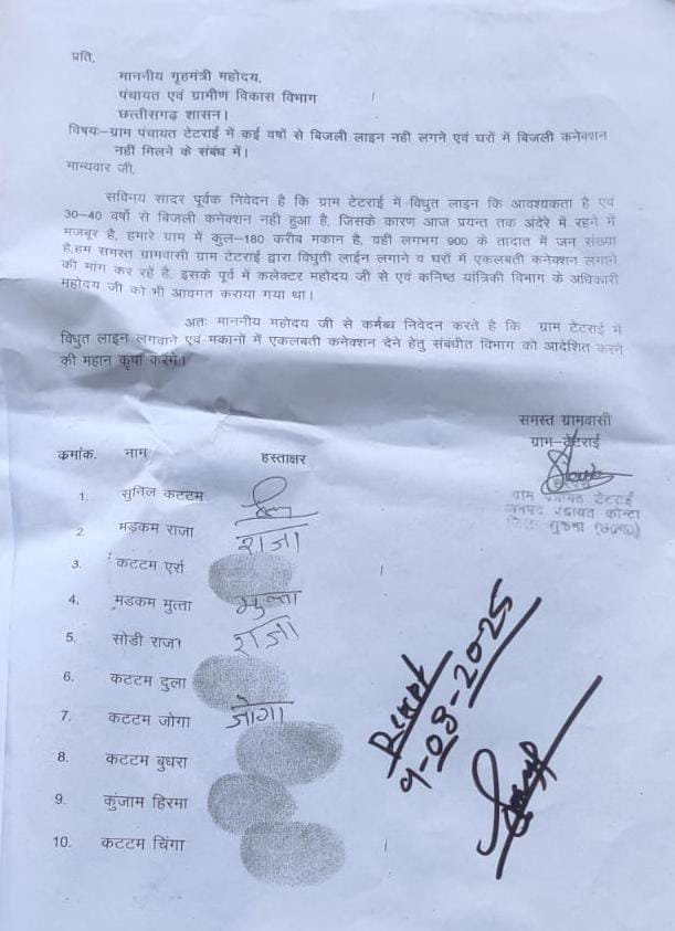 दोरनापाल । विकासखंड कोन्टा के ग्राम पंचायत टेटराई में आजादी के 78 वर्ष के बावजूद ग्राम पंचायत टेटराई में अब तक बिजली जैसी बुनियादी सुविधा से वंचित है। ग्रामीणों ने बताया कि पंचायत द्वारा छत्तीसगढ़ के उपमुख्यमंत्री को विद्युत कनेक्शन उपलब्ध कराने के लिए आवेदन किया गया था, परंतु कही माहीनो से आश्वासन के अलावा कोई ठोस कार्रवाई नहीं हुई है।