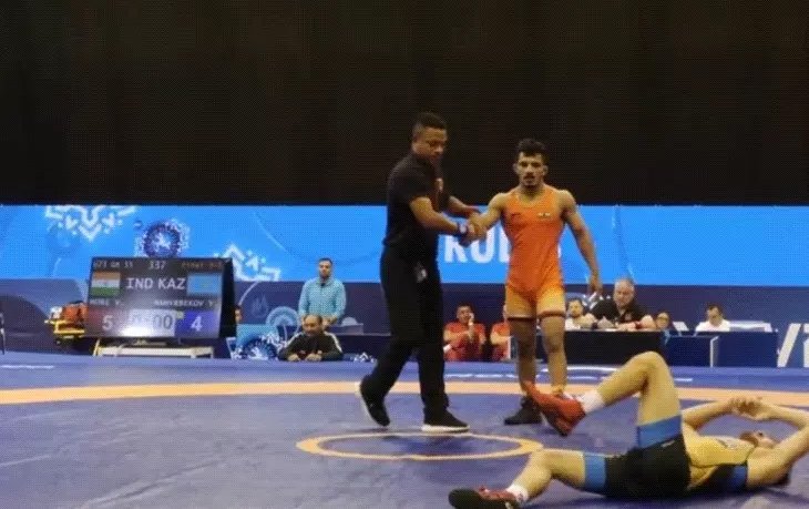55 किलो ग्रिको-रोमन में कजाकिस्तान पहलवान को 5-4 से हराया;अंडर-23 में भारत को पहला मेडल