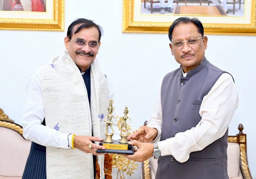 रायपुर। मुख्यमंत्री विष्णु देव साय से आज राजधानी रायपुर स्थित मुख्यमंत्री निवास कार्यालय में लोकसभा सांसद विष्णु दत्त शर्मा ने सौजन्य मुलाकात की। मुख्यमंत्री श्री साय ने श्री शर्मा का आत्मीय स्वागत करते हुए उन्हें शॉल एवं बस्तर आर्ट की आकर्षक प्रतिकृति भेंट कर सम्मानित किया। इस दौरान उनके बीच विभिन्न समसामयिक विषयों पर चर्चा हुई।