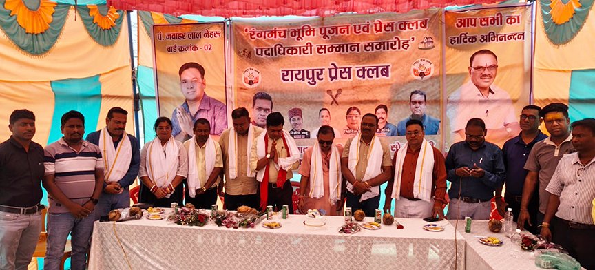 मीडिया कॉलोनी सोनडोंगरी में रंगमंच का भूमिपूजन, प्रेस क्लब पदाधिकारी रहे शामिल